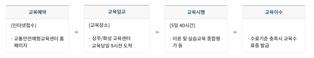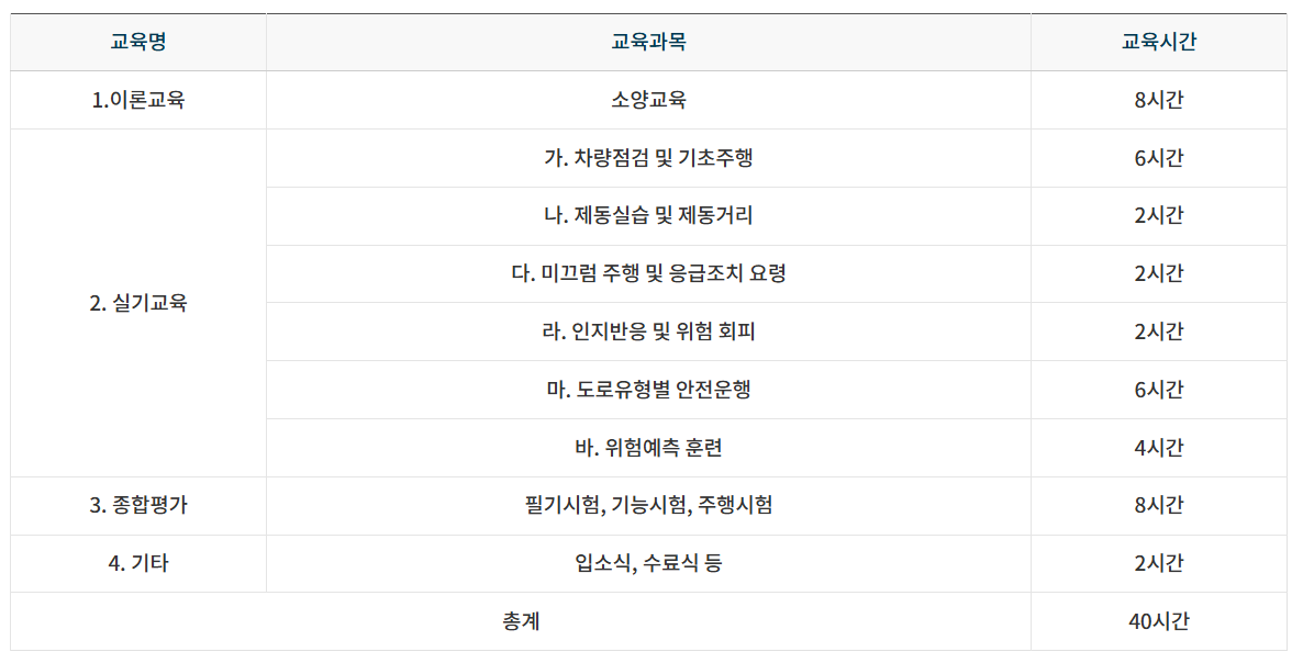 교육 수료를 하기 위해서는 이론 및 실기교육을 마쳐야 하며 필기평가 (20점), 기능평가1 (20점), 기능평가2 (30점), 주행평가 (30점) 이렇게 100점 중 60점 이상 받아야 합니다.