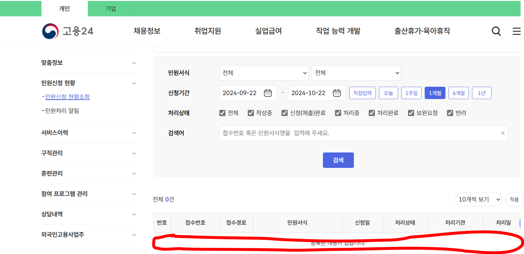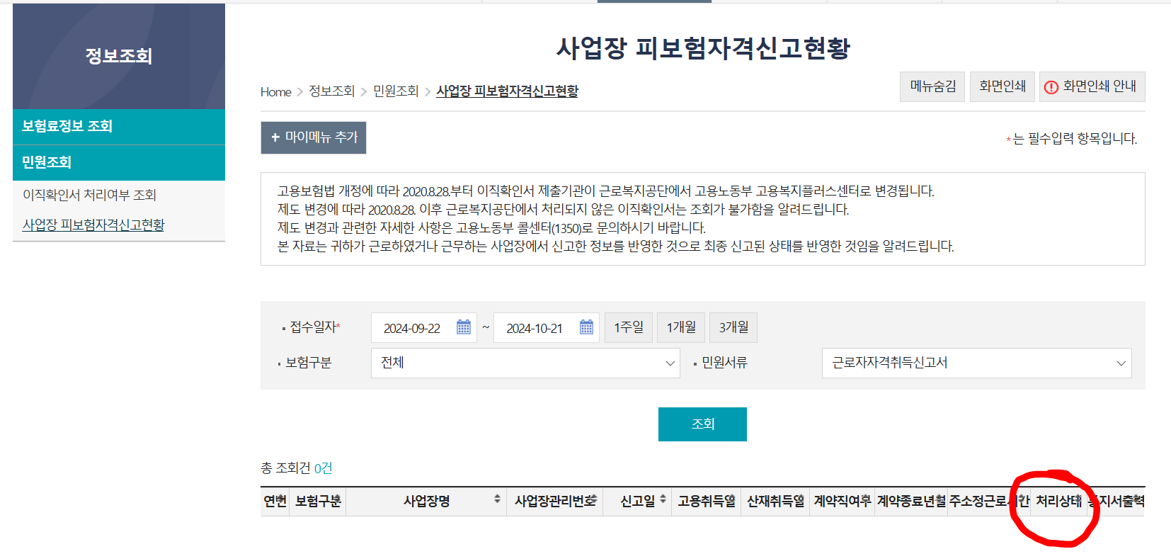 로그인하시고 마이페이지에 들어가셔서 민원신청 현황조회를 클릭하시면 이직확인서 처리여부를 확인하실 수 있습니다,