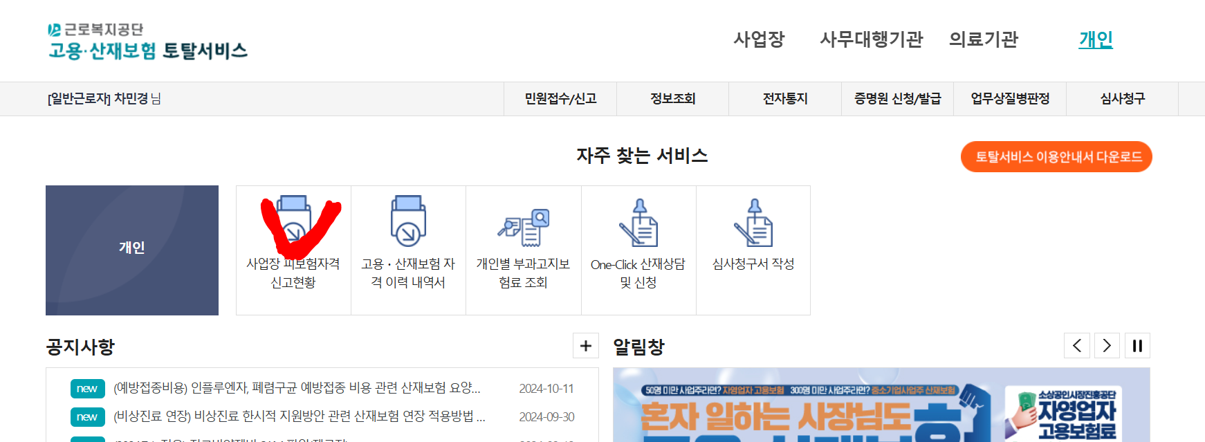 우선, 고용보험 산재보험 토탈서비스에 들어가셔서 로그인을 하고, 아래 화면이 뜨면 사업장 피보험자격 신고현황을 클릭해주세요.