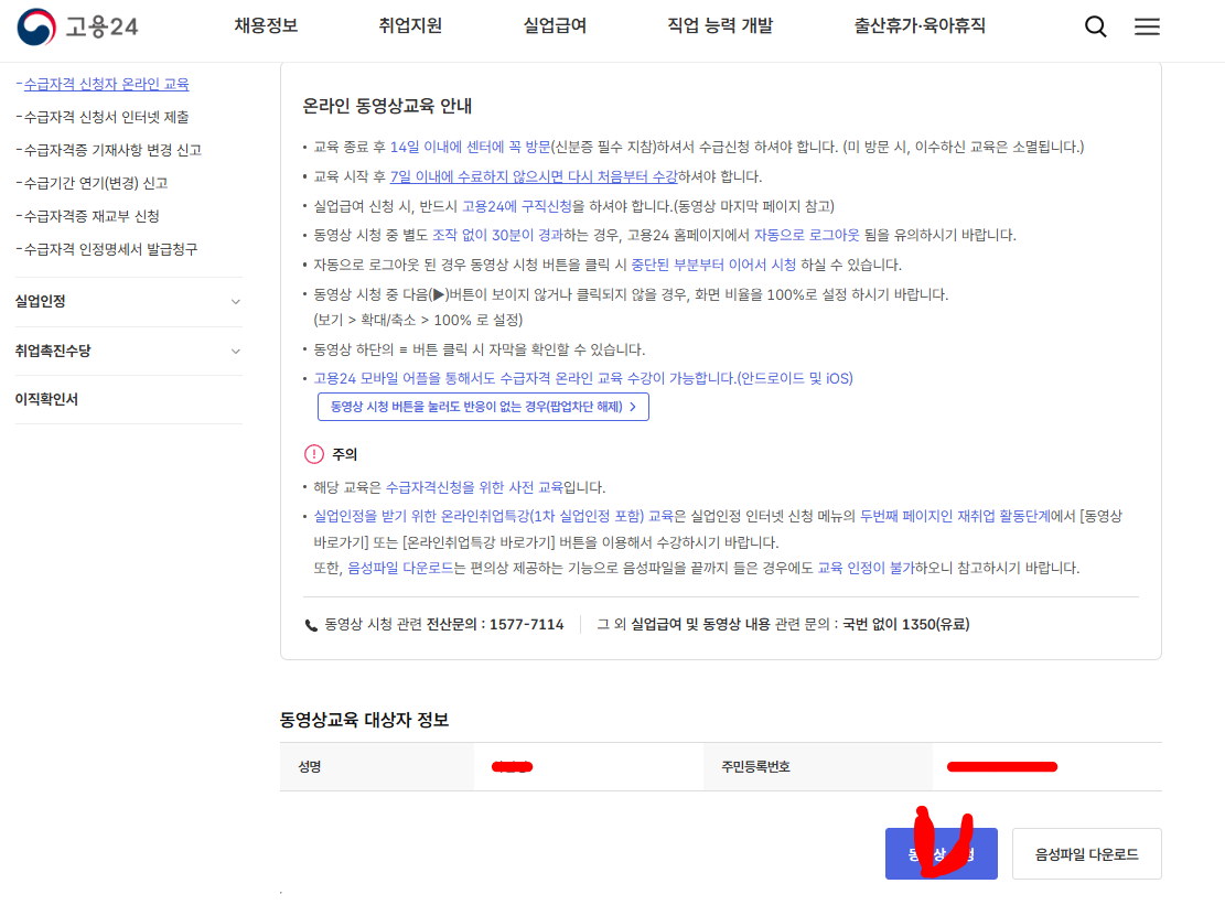 수급자격 온라인교육을 시청하는 것 또한 실업급여 수급 조건이며, 반드시 들어야 합니다. 구직신청과 똑같이 고용24에서 시청가능합니다.