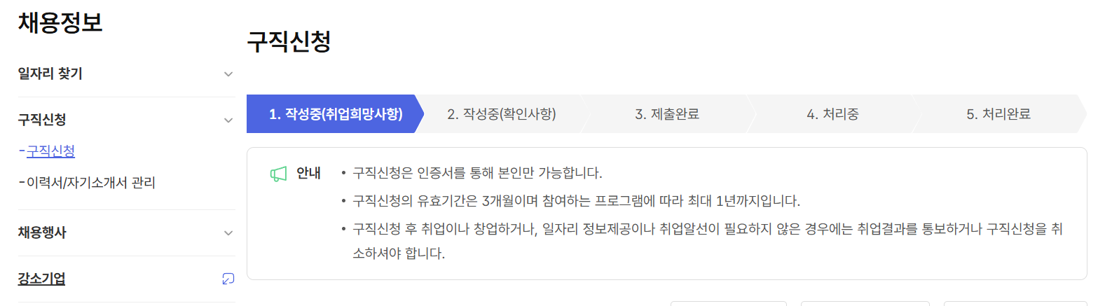 그리고 이력서를 포함하여 이 5단계를 작성하시면 구직신청이 완료됩니다.