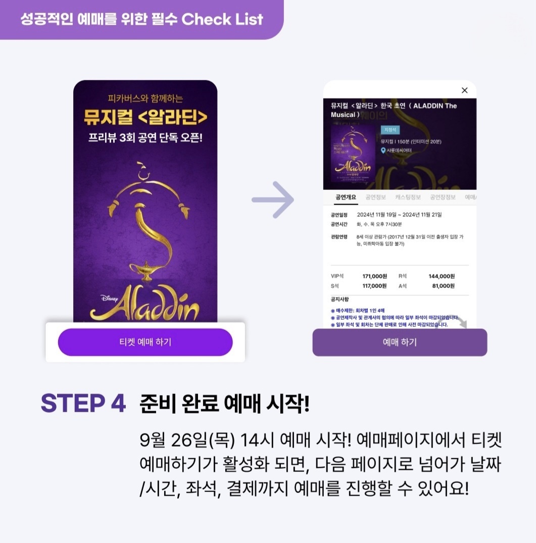 뮤지컬 <알라딘>이 많은 기대를 받고 있는 만큼 티켓팅도 굉장히 쉽지 않을 거라는 생각이 듭니다. 제가 알려드린 방법으로 프리뷰 티켓팅 성공하셔서 재미있는 관람되시길 바랍니다!