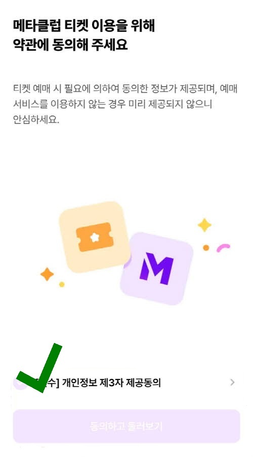 2. 티켓예매를 위한 약관동의 페이지가 나오면 체크해주시고 '동의하고 둘러보기'를 눌러주세요.
