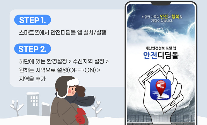 '안전디딤돌'은 부모님의 안전을 확인하고, 자녀가 부모님을 걱정하지 않도록 돕기 위해 만들어졌습니다. 행정안전부는 자녀가 부모님이 계신 곳과 지역을 달리하는 출장이나 외출할 때, 또는 타지에서 거주하는 경우에도 부모님의 안전을 확인할 수 있도록 '안전디딤돌' 앱을 통해 재난문자와 행동요령을 발송하는 서비스를 제공하며 재난 발생 시 필요한 행동요령을 쉽게 확인할 수 있습니다.