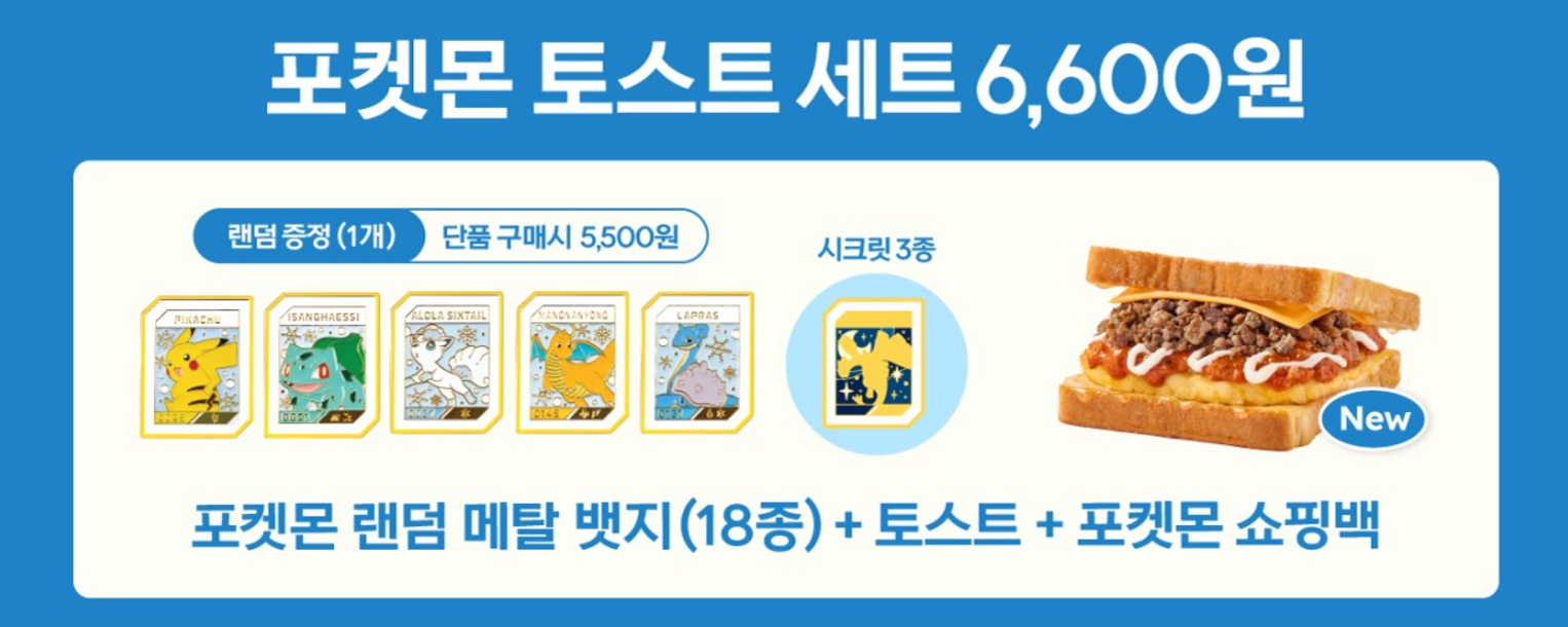 토스트를 구매하시면서 뱃지를 따로 구매하실 수도 있지만 포켓몬 토스트 세트를 구매하시면 토스트, 메탈 뱃지 랜덤 1종, 포켓몬 쇼핑백을 받아보실 수 있습니다. 그러나 프렌치 햄치즈는 6,600원이고, 감자 비프 라구 또는 비프 라구 선택 시 7,700원이라는 점 참고해주세요!