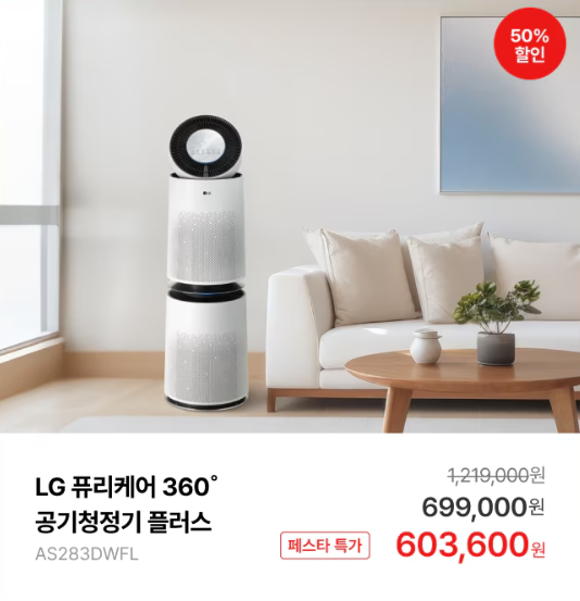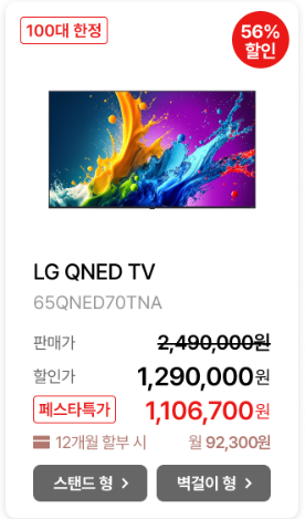 냉장고, TV, 노트북, 에어컨, 공기청정기 등 다양한 가전제품들이 파격세일을 하고 있습니다. 위 보이는 상품들은 현재 가장 핫한 상품들입니다. 이외에도 다양한 행사상품들이 있고, 최대 58% 할인과 이외에도 캐시백 할인, 사은품 제공 등 다양한 혜택을 제공합니다. 선착순으로만 구매가능한 상품도 있으니 참고해주시고, 같은 상품은 1대 이상 구매가 불가능합니다.