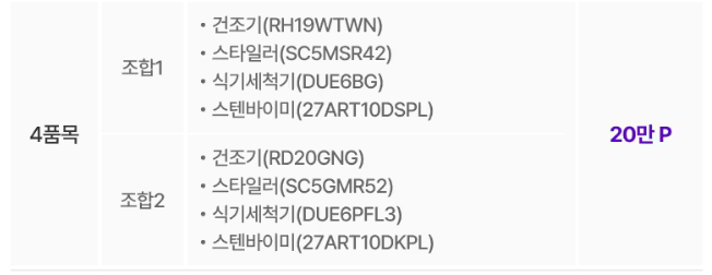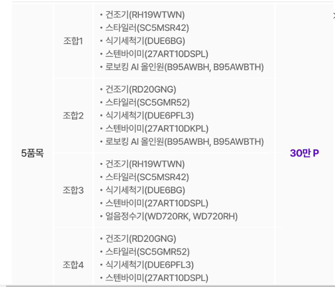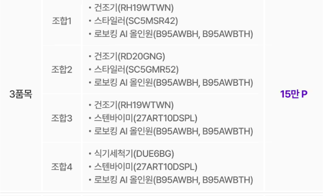 아래 나와있는 조합으로 구매를 하면 캐시백 혜택이 제공됩니다! 3품목은 15만 포인트, 4품목은 20만 포인트, 5품목은 30만 포인트로 상당한 헤택을 제공하니 패키지로 구매하시는 것도 고려해보시면 좋을 것 같습니다!
