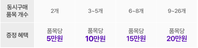 한번에 구매한 상품의 개수가 많을 수록 품목당 제공되는 할인혜택이 더 커지는데요! 2개 샀을 때는 품목당 5만원씩 총 10만원의 할인혜택을 받을 수 있고, 5개 이하는 품목당 10만원, 8개 이하는 품목당 15만원, 9개 이상은 품목당 20만원씩 해서 총 180만원의 할인혜택을 받으실 수 있습니다.