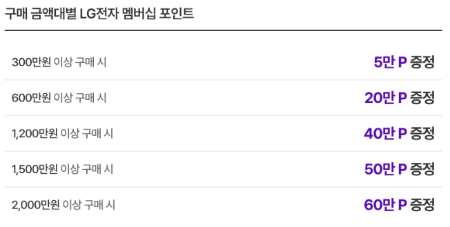 그리고 구매 금액대별로 받으실 수 있는 멤버십 포인트도 점점 커집니다! 최소 5만포인트부터 최대 60만 포인트까지 받으실 수 있습니다.