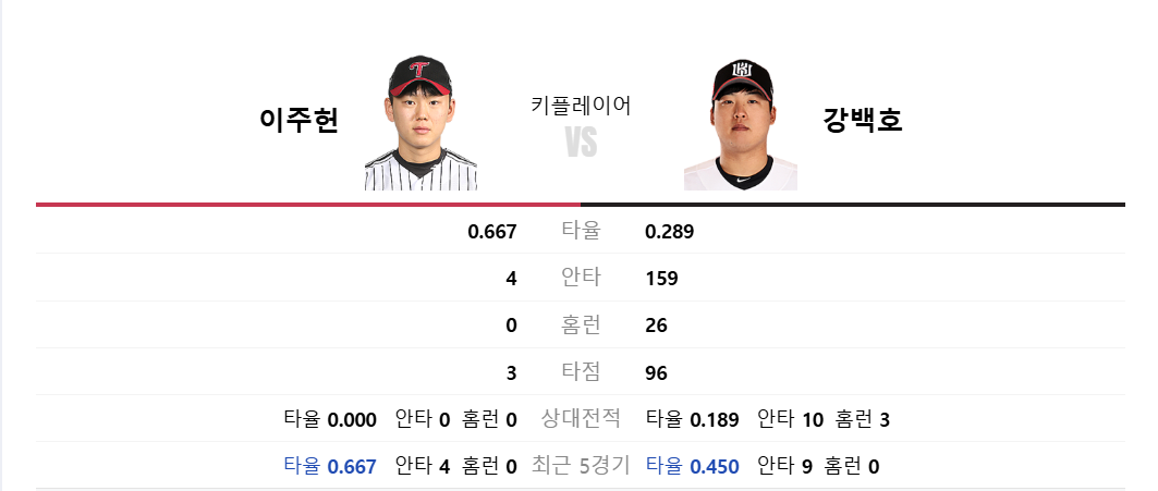 3차전 경기를 앞두고 발탁된 키플레이어 선수는 LG의 이주헌 선수, KT의 강백호 선수입니다. 두 선수를 비교해보았을 때 타율은 강백호 선수보다 이주헌 선수가 높지만 안타율과 홈런율을 봤을때 이주헌 선수가 강백호 선수보다 현저히 적어 강백호 선수가 보다 안정적이라고 볼 수 있겠습니다. 그래서 강백호 선수는 팀은 기둥이 되는 역할이 될 수 있을 것 같고 이주헌 선수는 팀에 한방이 필요할 때 히어로 역할이 될 수 있을 것 같습니다.