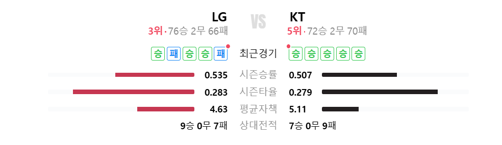 승률은 LG 0.535, KT 0.507로 LG가 비교적 높은 편이고, 타율은 LG 0.283, KT 0.279로 비슷하지만 LG가 조금 더 우세합니다. 평균자책점은 LG가 4.63로 KT보다 투수가 좋은 성적을 거두고 있다고 보입니다. 상대전적도 LG는 9승, KT는 7승으로 LG가 전반적으로 우세한 모습을 보이지만, KT가 점점 상승세를 타고 있습니다.